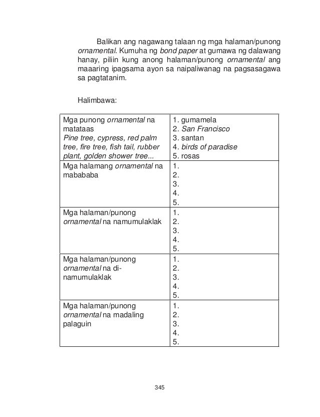 Mga halimbawa ng namumulaklak na halaman Ano ang ibig sabihin ng halamang gamot. Ornamental plant - Wikipedia. Jun 28 2017 5 n halimbawa ng mga halaman o punong ornamental na mahirap palaguin - 657257 ycelgragaslao ycelgragaslao 28062017 Filipino Senior High School answered expert verified 5 n halimbawa ng mga halaman o punong ornamental na mahirap palaguin 1 See answer danicaparra danicaparra 1 Bonsai -ay isang maliit na puno ng Hapon na lumaki sa mga.