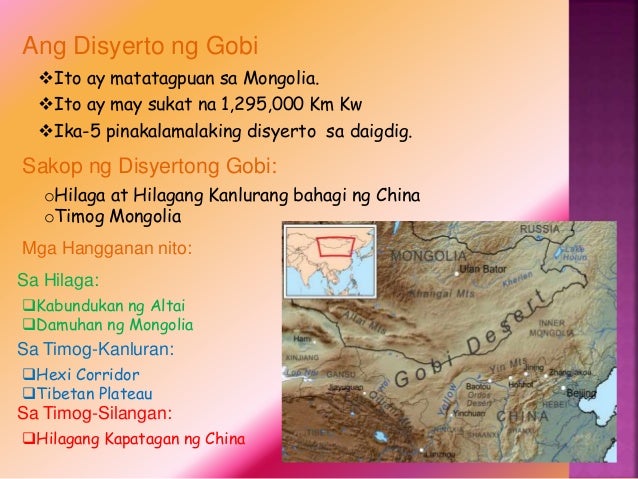 Ang pinakamalaking disyerto K sa Asya na nasasakupan ng mga bansang Mongolia at I China. 19032016 Ang Disyerto ng Gobi Ito ay matatagpuan sa. Japan Ika-10 bansa na may pinakamalaking populasyon 38 BUONG POPULASYON NG ASYA AY NASA REHIYON 22 NA POPULASYON NG DAIGDIG DISYERTO NG GOBI Ang Disyerto ng Gobi Ito ay matatagpuan sa Mongolia.