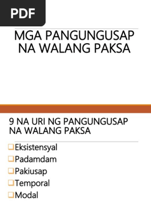 NA WALANG PAKSA 9 NA URI NG PANGUNGUSAP NA WALANG PAKSA Eksistensyal Padamdam Pakiusap Temporal Modal 9 NA URI NG PANGUNGUSAP NA WALANG PAKSA Mga Ka-pandiwa Penomenal Mga Panawag Pambating Panlipunan Nagsasaad ng pagkamayroon o-pagkawala. Sequential Easy First Hard First. 8162012 Pangungusap Na Walang Paksa.
