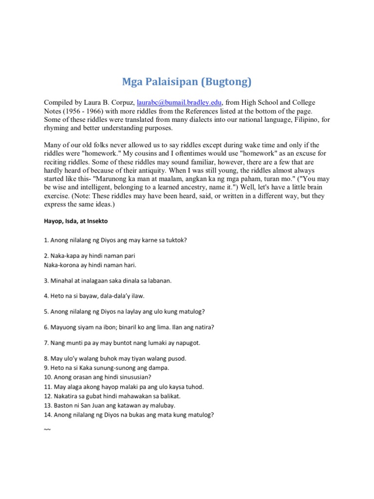 Sangay ng Pananalapi at Pangasiwaan SPP Ang Filipino. Ang bugtong o riddle sa wikang ingles ay isang tanong o pangungusap na nilulutas bilang isang palaisipan. Nagtatalo-talo ang mga kapitbahay kung saan babagsak ang.
