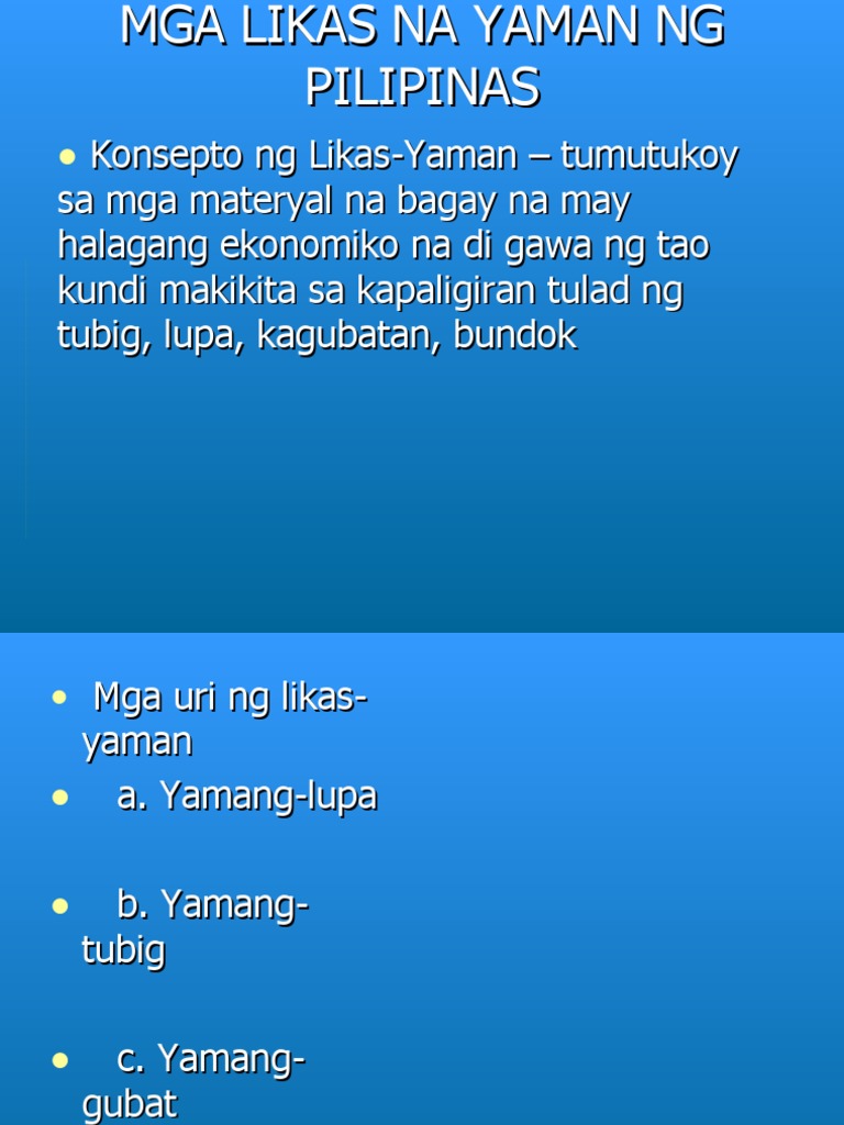7 7 found this document not useful Mark this document as not useful. Download as PPTX PDF TXT or read online from Scribd. Inihahandog sa inyo ang gawa ng mga mag-aaral ng Cabadbaran City NHS and ibat ibang uri ng larawan ng mga likas na yaman ng Pilipinas.