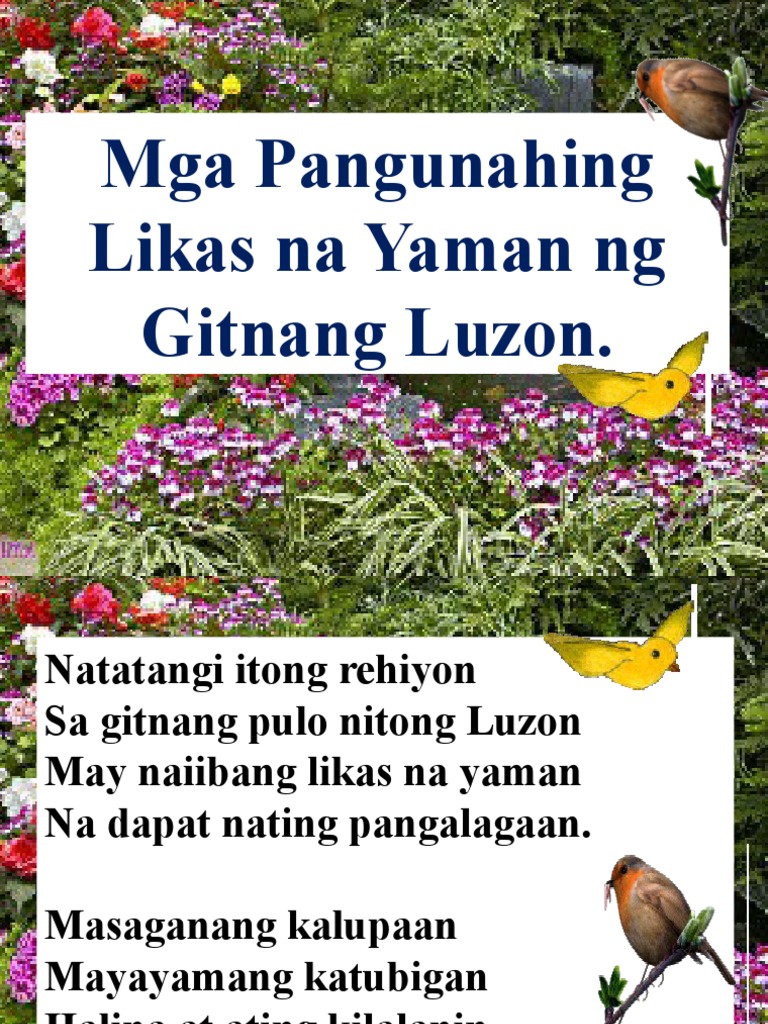 Masaganang kalupaan Mayayamang katubigan Halina at ating kilalanin Yaman to ng bawat isa satin. Ang mga likas na yaman ay makikita sa kapaligiran at pangunahing pinagkukunan ng mga pangangailangan ng mga tao. 11162018 Ang mga magagandang tanawin sa bawat rehiyon ng Pilipinas.